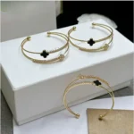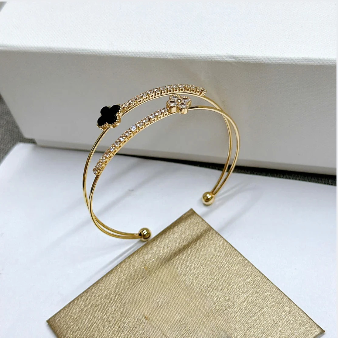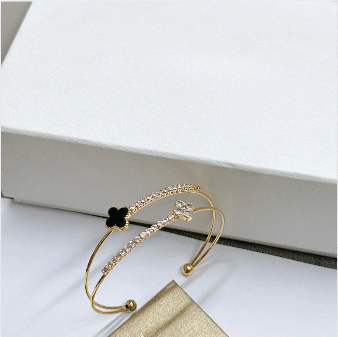 Double-Layer Open Bangle Bracelet with Clover Motif and Sparkling Crystal Accents Free Shipping