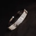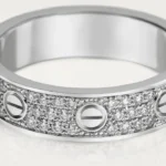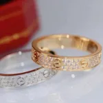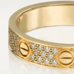 Discover the Love Ring 4mm Diamond Paved with pavé-set diamonds. Expertly crafted for lasting elegance, this ring is perfect for expressing love and commitment on any occasion. Available in Rose Gold and Silver, it is made from 925 Sterling Silver with options for 18k Gold Plating. Offered in US sizes 5 through 10, this high-quality replica closely matches the original in both color and craftsmanship.