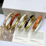 The bangle is adorned with recognizable, embossed signature motifs, including the prominent ‘V’ and the elegant floral-star shape, creating a bold, eye-catching pattern. It’s the perfect accessory to transition seamlessly from day to night. Wear a single color for a chic, minimalist statement, or stack multiple bangles from the collection to create a dramatic, personalized wrist party. Its smooth finish ensures a comfortable, luxurious feel on your skin.