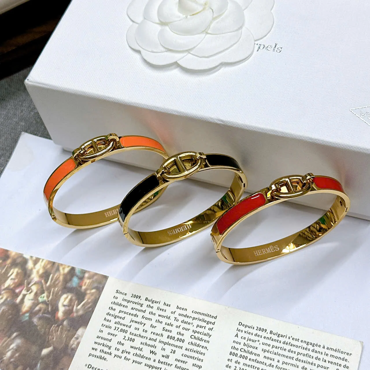 Infuse your look with a playful touch of designer-inspired sophistication with our Vibrant Logo Enamel Bangle. This captivating piece features a sleek, gold-tone metal base accented by a high-gloss, colorful enamel inlay (available in Blush Pink, Passion Red, Crisp White, Classic Black, and Sunset Orange).