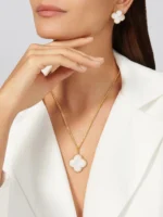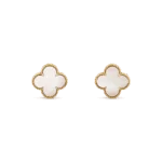Elegant and ethereal, the Magic Alhambra Earrings are a tribute to timeless design and natural beauty. Shaped in the iconic four-leaf clover silhouette, each earring is crafted from 925 sterling silver and plated in a rich 2.5-micron layer of 18K Yellow Gold Vermeil. The centerpiece features luminous white mother-of-pearl, framed by a delicate beaded edge for added texture and refinement. Lightweight and hypoallergenic, these earrings radiate softness and sophistication—perfect for everyday wear or special occasions that call for effortless grace.