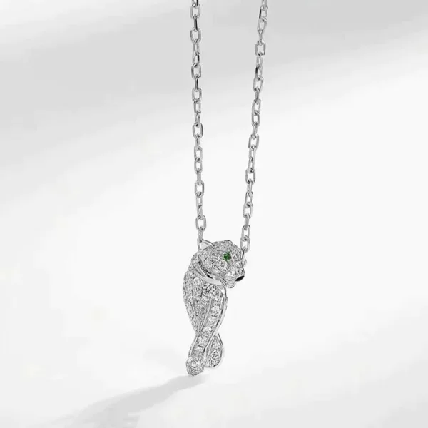 Discover the Panthere Pendant Silver Diamond Necklace, expertly crafted to showcase a dazzling panther pendant embellished with brilliant diamonds. This elegant necklace brings a refined and luxurious accent to any ensemble, making it a timeless addition to your jewelry collection. Available in silver with cubic zirconia stones, it is made from high-quality 925 sterling silver, 18k gold plating. Our replicas closely match the original in quality and color.