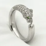 The Panthere Ring Diamond 7.3mm features a stunning 7.3mm diamond, expertly crafted to exude timeless elegance. Its precise detailing reflects superior workmanship, making it a sophisticated accessory for any occasion. Available in silver and rose gold, the ring is set with cubic zirconia stones in 925 sterling silver, with 18k gold plating. Offered in US sizes 5 to 8, this high-quality ring closely mirrors the original.