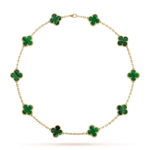 The Vintage Alhambra Malachite 10 Motifs Necklace showcases a masterful fusion of natural elegance and refined artistry. Featuring ten carefully selected Malachite stones, each carved into the iconic clover motif, this necklace embodies symbols of good fortune and enduring style. With a length of approximately 42 cm (16.5 inches), it rests delicately just below the collarbone, offering versatile wear—whether as a standalone piece for understated sophistication or layered to enhance your ensemble’s complexity. Crafted with 18K Gold Vermeil over a 925 sterling silver core, the necklace ensures both lasting durability and a luminous finish, making it a distinguished and enduring addition to any fine jewelry collection.