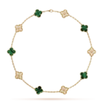 The Vintage Alhambra Malachite Diamonds 10 Motifs Necklace showcases a refined fusion of natural malachite and sparkling diamonds, each crafted into the signature clover shape symbolizing luck and enduring style. Measuring about 42 cm (16.5 inches), it rests elegantly below the collarbone, perfect for wearing solo or layered. Crafted with 18K Gold Vermeil over a 925 sterling silver base, this necklace combines durability with a luminous finish, making it a sophisticated and lasting addition to any jewelry collection.