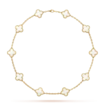 The Vintage Alhambra Mother of Pearl 10 Motifs Necklace showcases a refined fusion of natural elegance and masterful design. Featuring ten mother-of-pearl clover-shaped motifs, each symbolizing luck and enduring sophistication, this necklace measures about 42 cm (16.5 inches) and rests delicately below the collarbone. Its 18K Gold Vermeil finish, crafted over a 925 sterling silver base with a 2.5-micron gold layer, ensures both durability and a luminous sheen. Perfect for wearing solo or layered, this necklace is a distinguished and lasting addition to any jewelry collection.