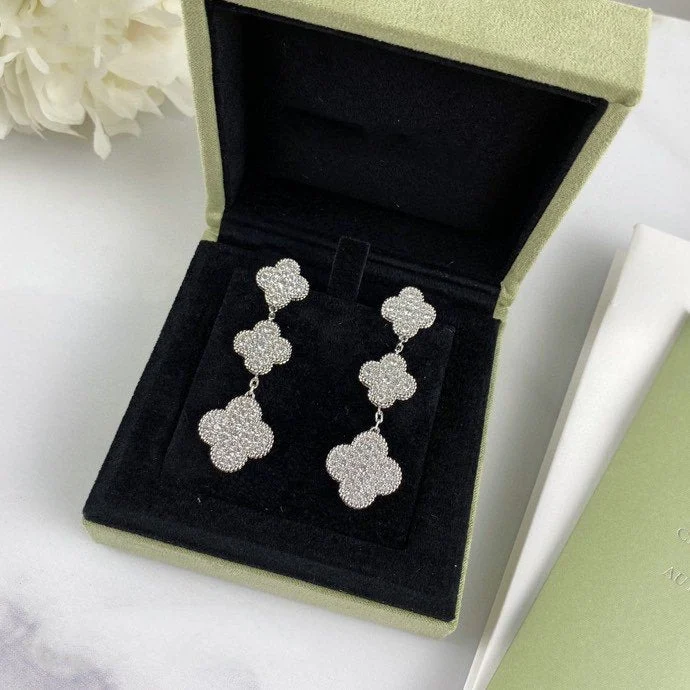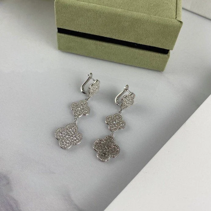 [Zyrono] CLOVER 3 MOTIF DIAMOND SILVER DROP EARRINGS Free Shipping