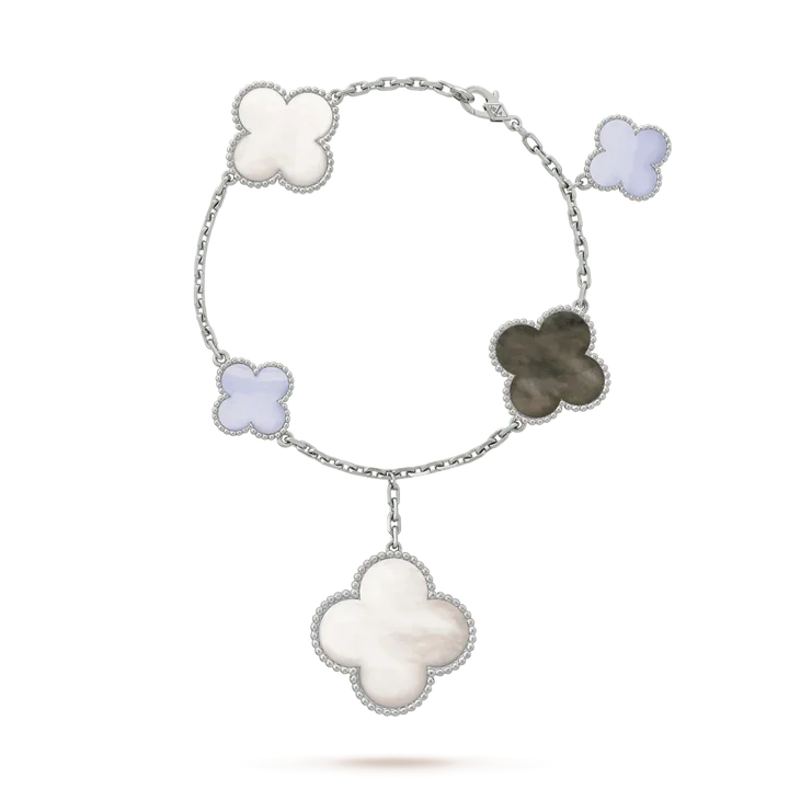Indulge in the luxury of our Clover 5 Motifs Silver White MOP Bracelet. Crafted with sophistication and elegance, this bracelet features five intricately designed clover motifs in shimmering silver with a white mother of pearl accent. Make a statement of exclusivity with this elegant piece.