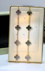 Elevate your style with our Clover Black Mop Pink Gold Bracelet, featuring five intricate motifs. The luxurious black mother of pearl and delicate rose gold make this bracelet a true statement piece. A symbol of luck and prosperity, it will add an elegant touch to any outfit.
