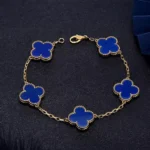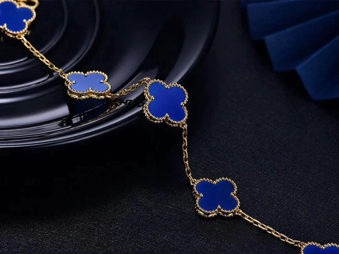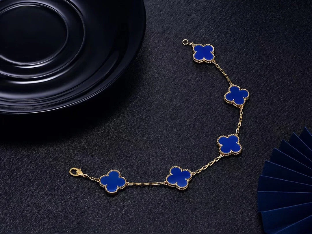 Indulge in elegance with our Clover Bracelet featuring 5 stunning blue agate motifs. This luxurious piece exudes exclusivity and sophistication, making it the perfect addition to your jewelry collection. Elevate your style with this intricate and unique bracelet.