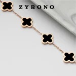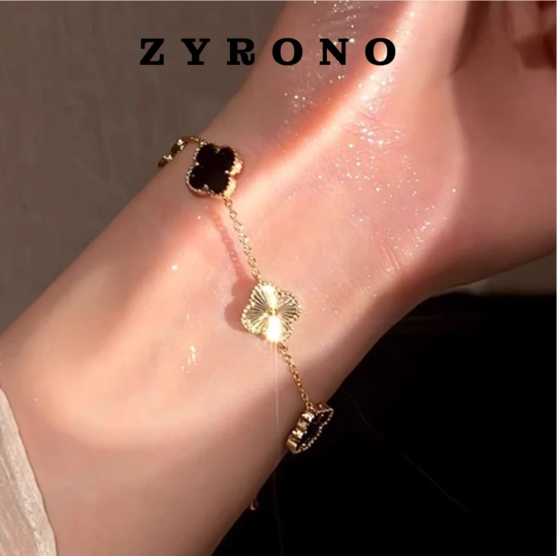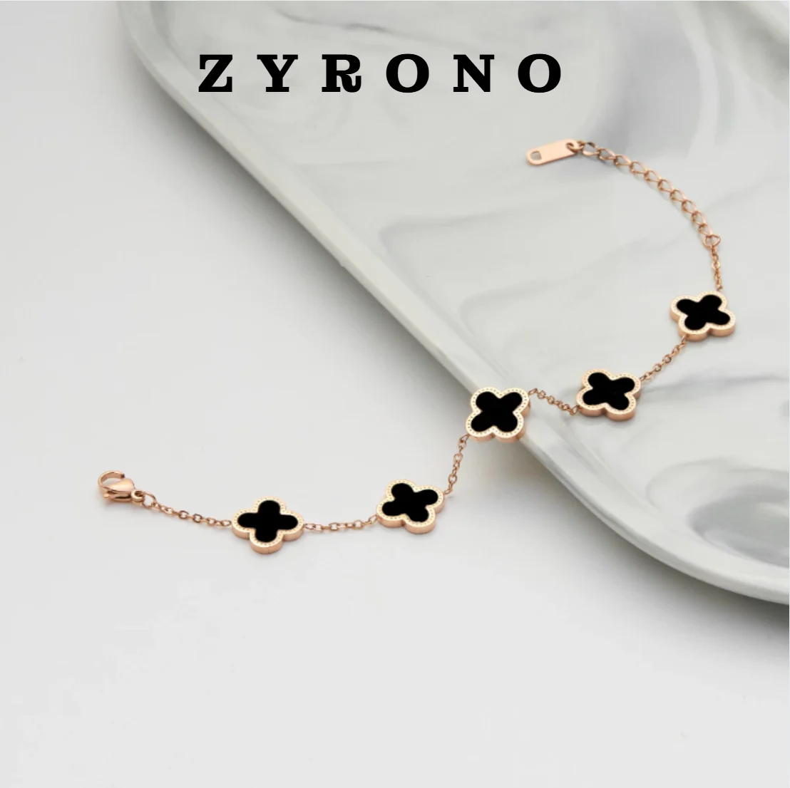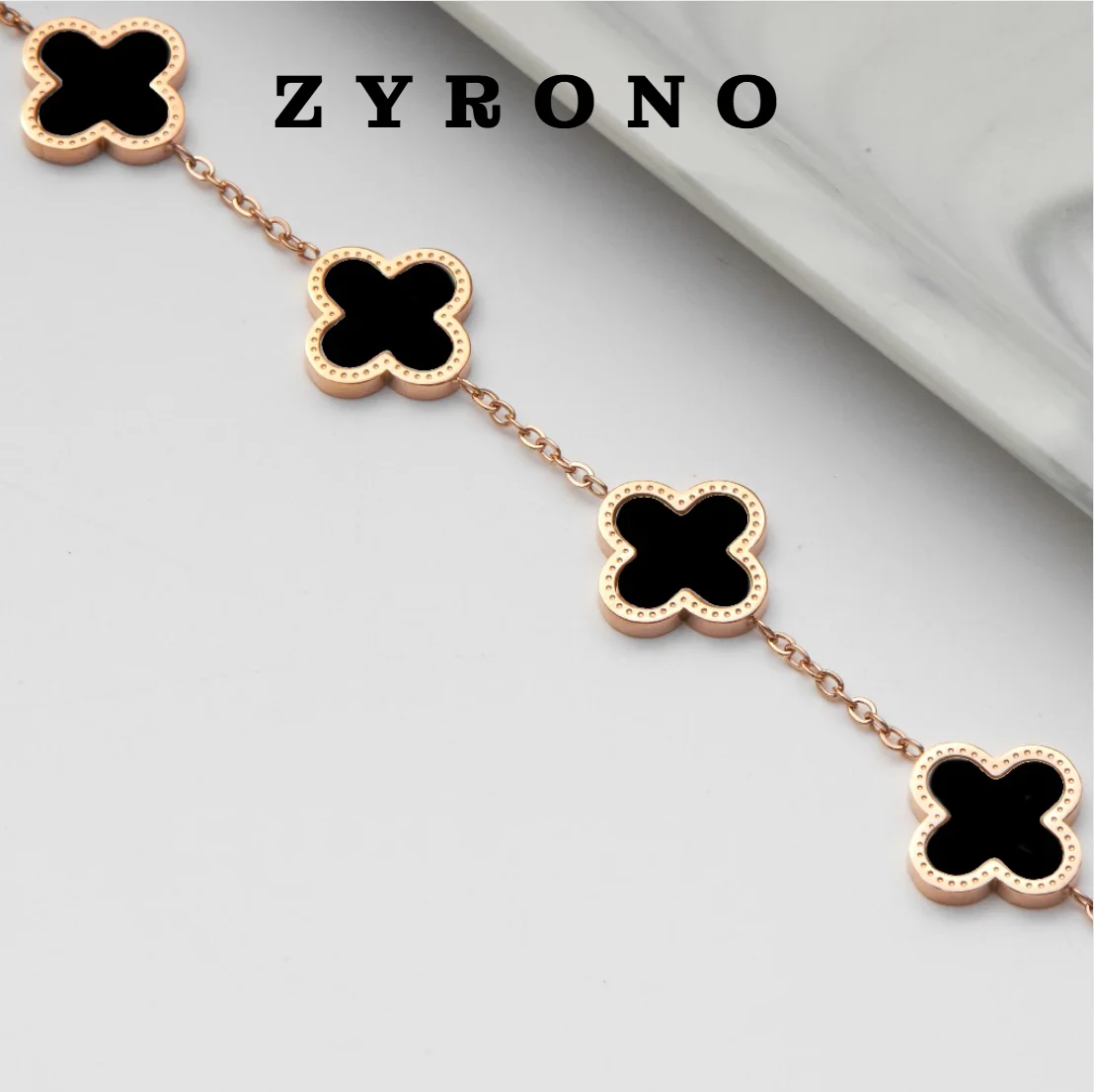 The ZYRONO Five Four Leaf Clovers Bracelet is designed with five four-leaf clovers crafted from premium titanium, creating a perfect blend of elegance and mystery. Each clover petal is adorned with shimmering black mother-of-pearl, adding a captivating contrast and unique charm to this exquisite bracelet.