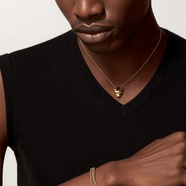 Powerfully poised and intensely focused, this necklace commands attention with a single glance. At its center rests a sculpted panther head—sleek, angular, and smooth—its surface detailed with inky enamel spots and luminous gemstone eyes that seem to follow your every move.