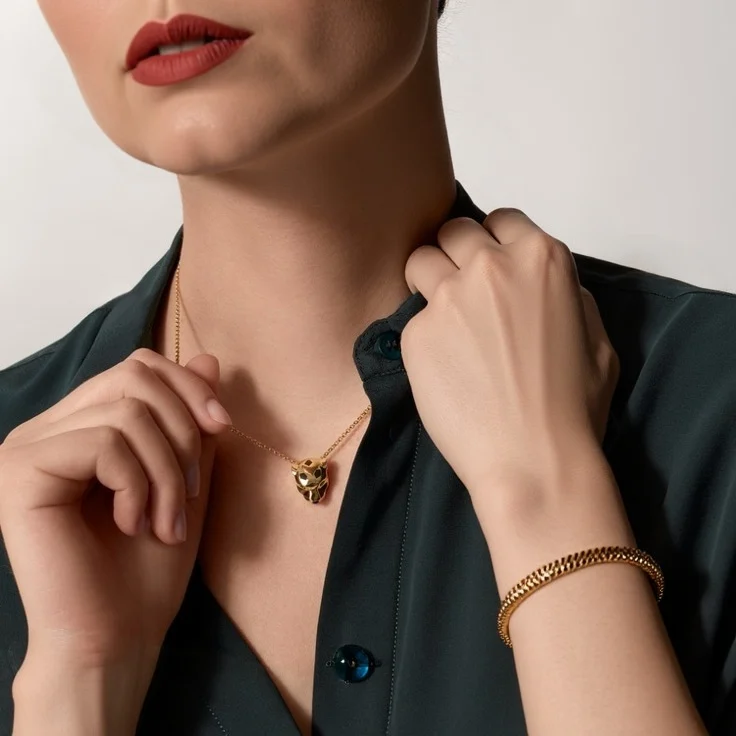 The Golden Gaze of Strength – Modern Necklace with Panther Head and Piercing Gem Eyes is a symbol of confidence and clarity. It captures the raw elegance of the wild and distills it into a wearable statement of presence, instinct, and control.
