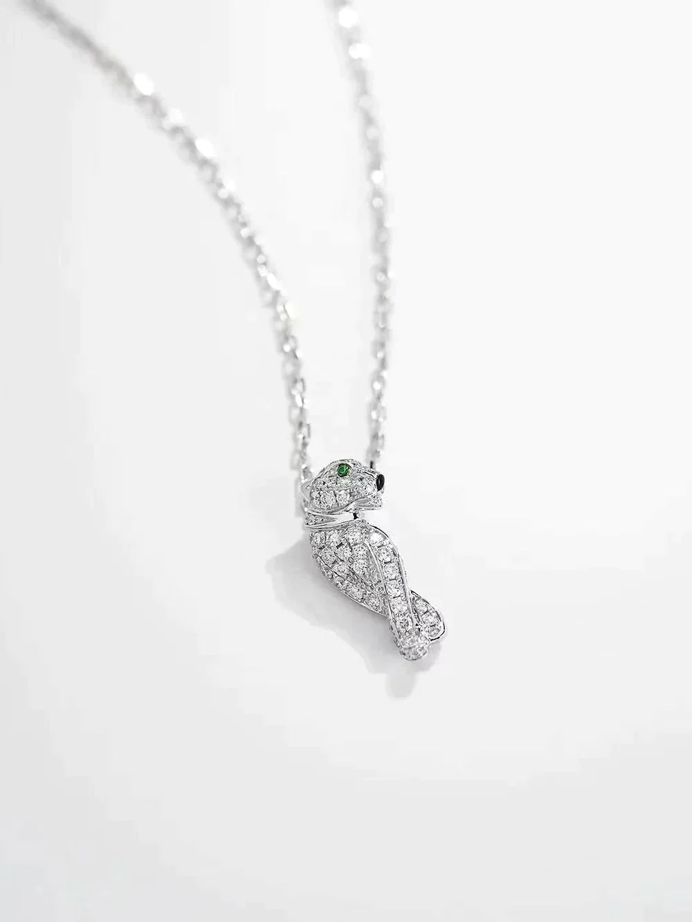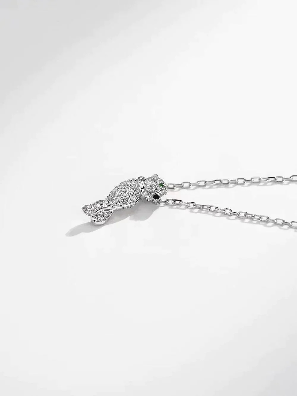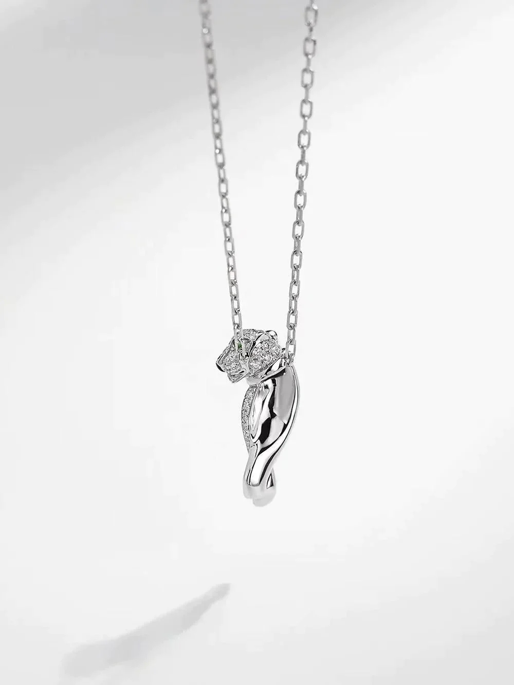 Introducing the Panthere Pendant Silver Diamond Necklace. Crafted with precision and elegance, this necklace features a stunning panther pendant adorned with sparkling diamonds. This timeless piece is the perfect addition to your jewelry collection, adding a touch of sophistication and luxury to any outfit.