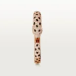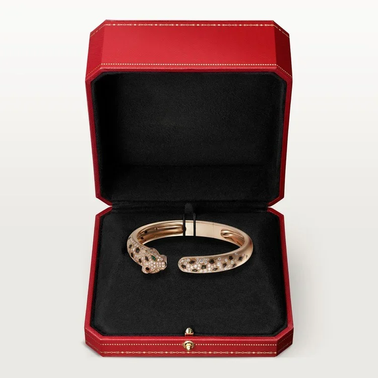 A crown on the wrist, the Pink Gold Bracelet of the Panther Queen – Sparkle Touch in its medium model exudes untamed elegance. Enveloped in a constellation of diamonds and panther-like black enamel rosettes, the golden body coils into form with a feline grace. Emerald-green eyes stare ahead — poised, focused, and full of fire.