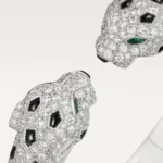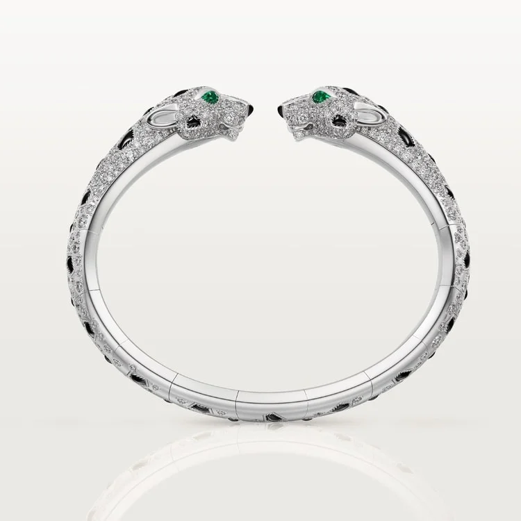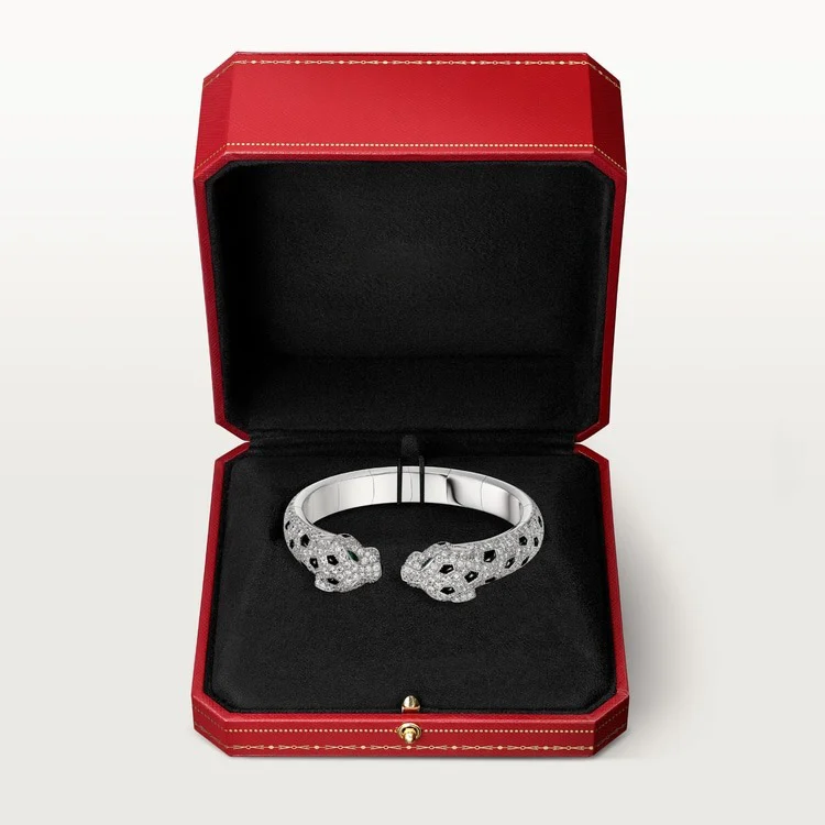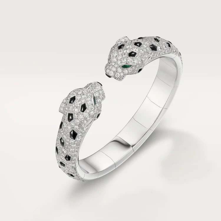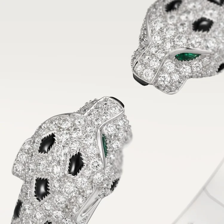 Two souls. One will. The White Gold Bracelet of the Panther Queen – Twin Fangs brings the wild to life with a striking articulated design where two panther heads meet in poised confrontation — or eternal protection. Crafted in radiant yellow gold and brought to life with vivid emerald eyes and bold black enamel spots, each panther face mirrors strength, instinct, and unwavering elegance.