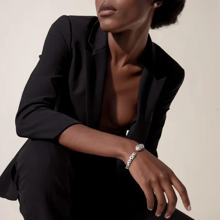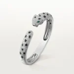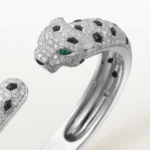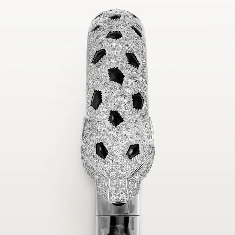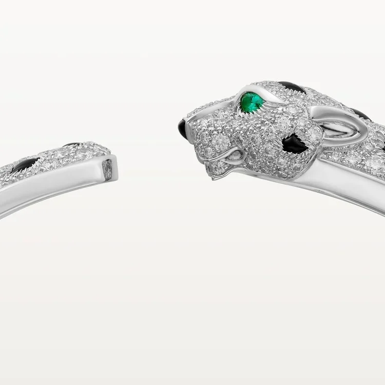 A crown on the wrist, the White Gold Bracelet of the Panther Queen – Sparkle Touch in its medium model exudes untamed elegance. Enveloped in a constellation of diamonds and panther-like black enamel rosettes, the golden body coils into form with a feline grace. Emerald-green eyes stare ahead — poised, focused, and full of fire.