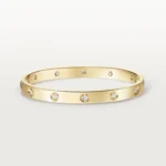 Ten evenly spaced round stones glimmer across a sleek golden band, offering a perfect balance of symmetry and luminosity. With its polished silhouette and graceful sparkle, this bracelet is a timeless statement of elegance. Whether worn alone or layered, it brings effortless glow to any occasion, from everyday grace to formal charm.